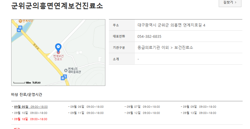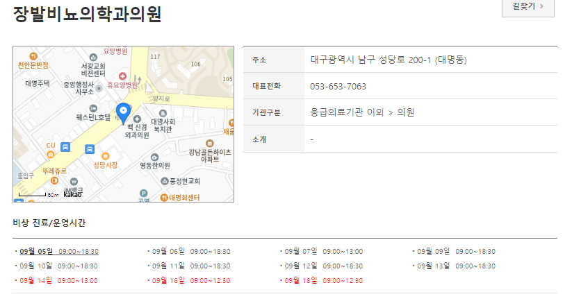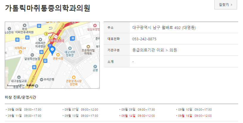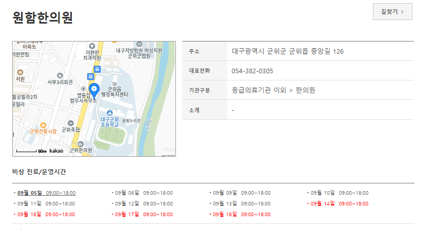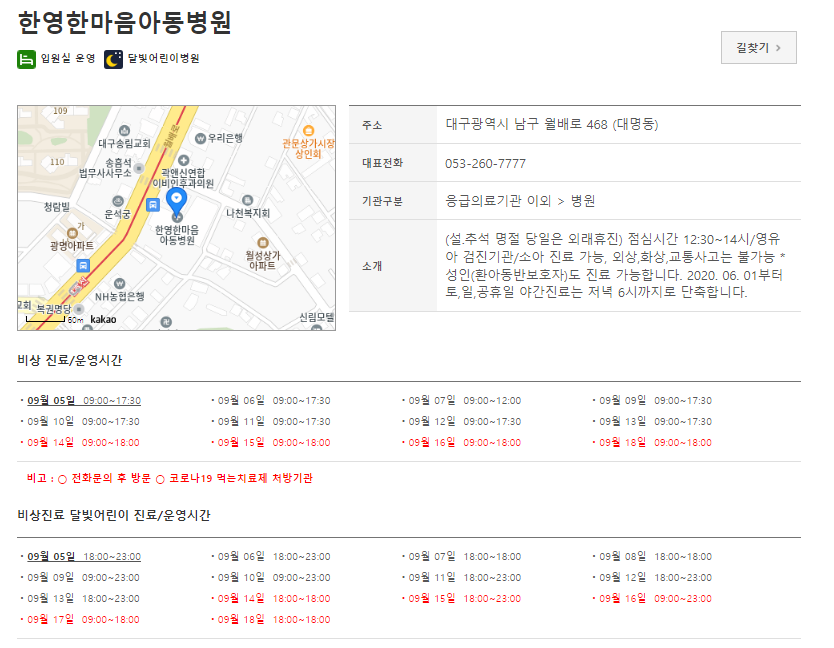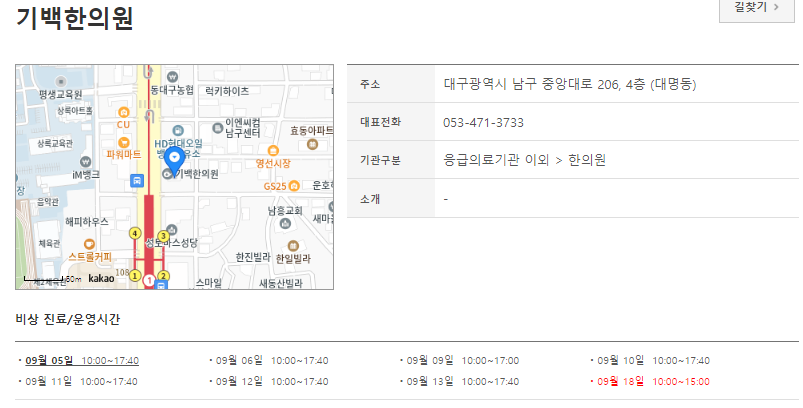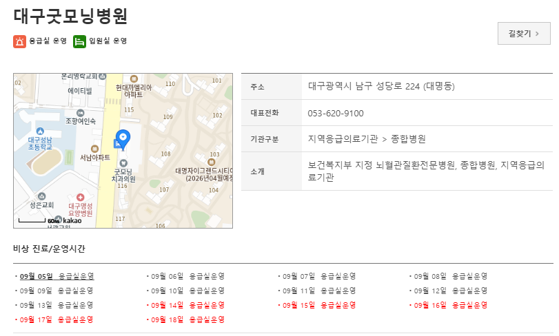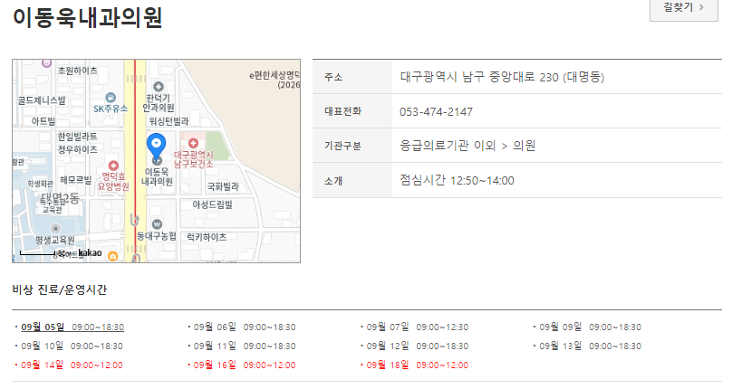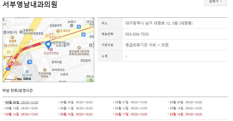 추석명절이나 주말 일요일 갑자기 아팠을때, 응급상황이 발생할때 난감할때가 있다. 비상진료 병의원, 약국 안내는 129, 119에서도 확인 가능하다. 아래 병의원 정보는 관할보건소에서 제출한 자료이다. 관련 문의사항은 관할 보건소로 연락하면된다. 자세한 사항은 E-Gen 이젠 어플을 통해 대구 뿐만 아니라 다른지역도 자세히 조회할 수 있다. 헛걸음 하지 않도록 꼭 먼저 유선으로 확인하고 방문하기 바란다.