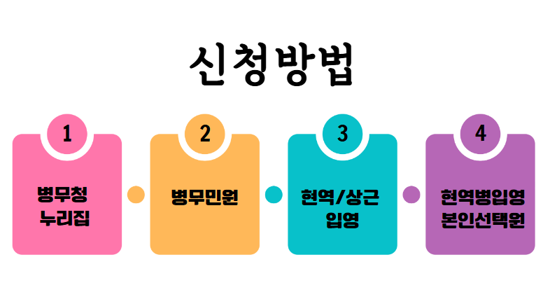 1) 스마트폰(병무청 앱)을 사용하여 신청할 경 접수시작 시간에 작동이 느려질 수 있으므로, PC를 사용한 신청 권장 ▶ 다음 접수 일정(예정) : 병무청 누리집 공지사항 참고